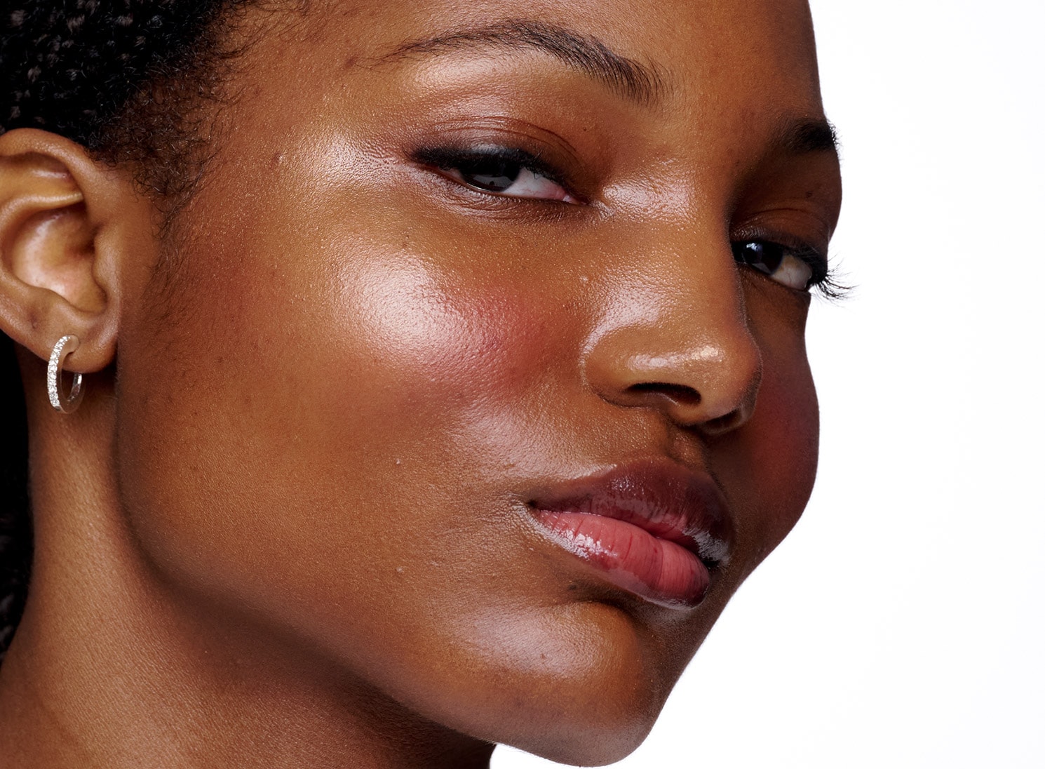 - Glossy pout. A bit of soft pink or rose on the lips for the final touch.